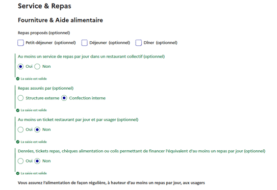 Selon les éléments cochés, des données supplémentaires apparaissent à renseigner : repas assurés par confection interne ou externe, part de la gratuité des denrées alimentaires utilisées pour les repas, part des denrées alimentaires achetées via la Banque alimentaire.