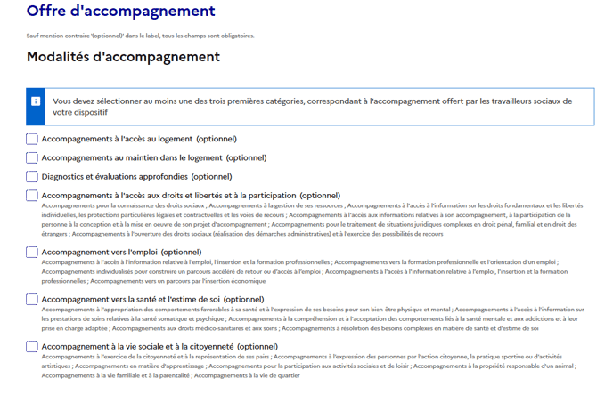 Sélectionnez au moins une des trois premières catégories correspondant à l’accompagnement proposé par les travailleurs sociaux de votre dispositif.