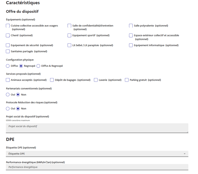 Cochez les équipements disponibles, puis renseignez la configuration physique, les services proposés, les partenariats conventionnés, le protocole de réduction des risques et le projet social du dispositif.