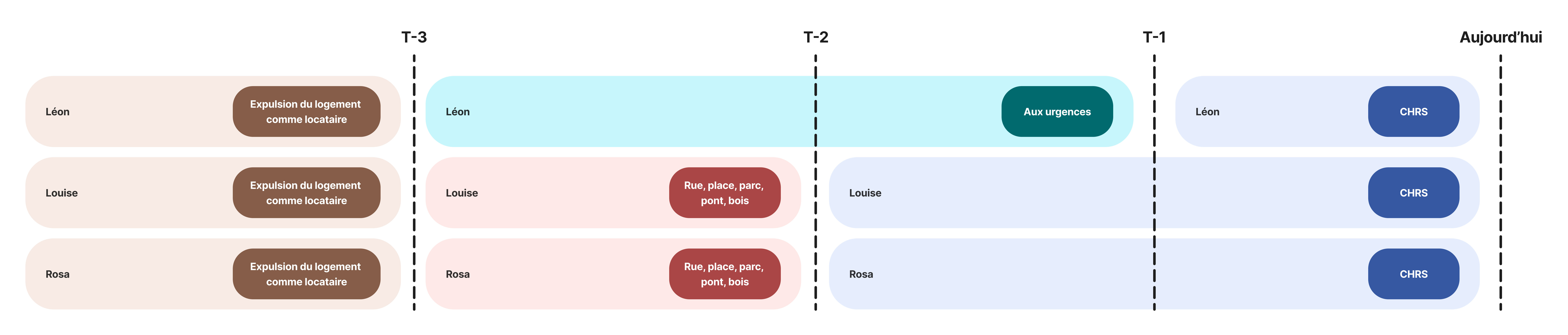 Entre T-2 et T-1 : Léon est encore hospitalisé, Louise et Rosa sont hébergées en CHRS