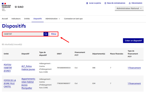 Le tableau "Dispositifs" permet d’appliquer plusieurs filtres combinés :