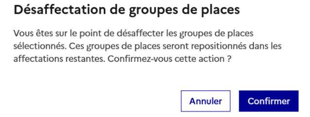 En cliquant dessus, une fenêtre de confirmation apparaît. Une fois validée, les groupes sélectionnés quittent « Affectations réalisées » et retournent dans la vue « Affectations à réaliser ».