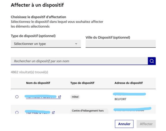 En cliquant sur "Affecter à un dispositif" l'utilisateur peut sélectionner le dispositif du module Offre vers lequel il souhaite rattacher les groupes de places sélectionnés.