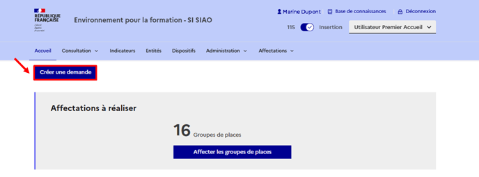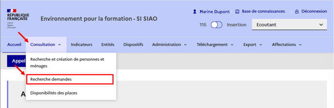En tant qu'Utilisateur Premier Accueil (UPA), cliquez sur le bouton "Créer une demande" ou depuis un autre utilisateur, accédez à l'onglet "Consultation" dans la barre de navigation, puis sélectionnez "Recherche demandes" :