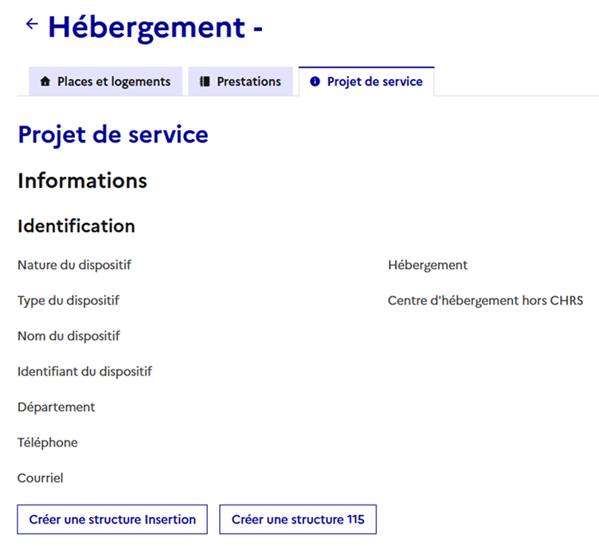 La création d'une structure peut également se faire à partir d'un dispositif déjà créé. Il vous suffit pour cela d'accéder à la fiche du dispositif en question, puis dans l'onglet "Projet de service", cliquer soit sur "Créer une structure Insertion" ou sur "Créer une structure 115". Vous pourrez retrouver votre structure Insertion ou 115 dans la gestion des structures directement.