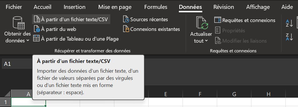Ouvrez un fichier Excel vierge et allez dans l'onglet Données, puis cliquer sur "A partir d'un fichier texte/CSV" :