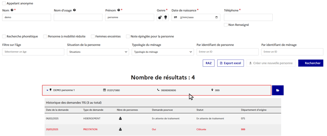 Pour distinguer les homonymes, nous vous invitons à renseigner le plus de critères de recherche possibles et à consulter les demandes relatives aux personnes restituées dans les résultats de recherche en cliquant sur la ligne associée à la personne.