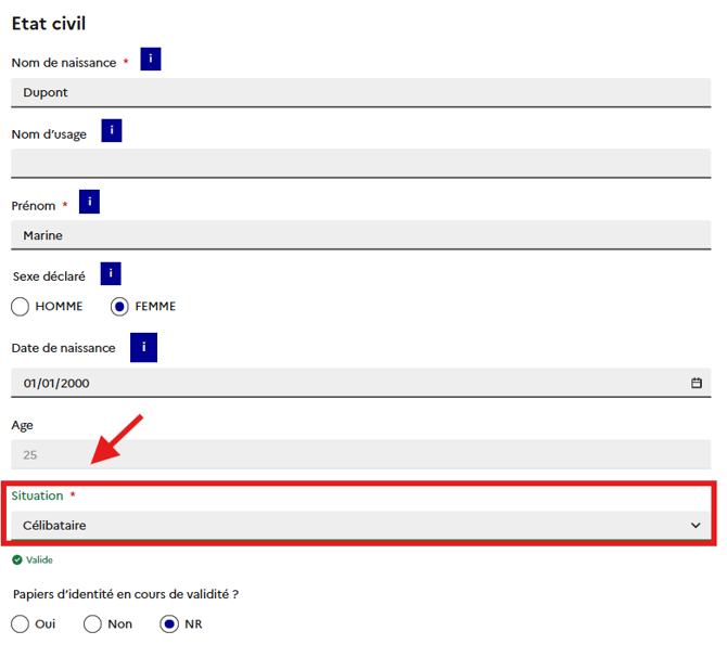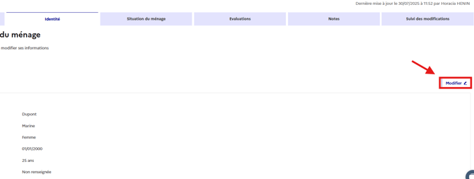 Il est nécessaire de compléter le champ Situation de la personne que vous venez de créer lorsque vous arrivez dans l'onglet Identité. Pour cela, cliquez sur "Modifier" puis dirigez-vous vers la section Etat Civil.