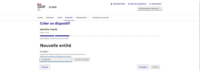 Si l’entité n’existe pas encore dans le SI SIAO, il est possible de la créer durant l’étape 1.