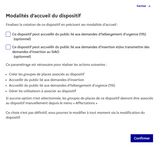Lorsque vous terminez la création d'un dispositif, vous serez amené à renseigner les modalités d'accueil du dispositif, parmi 115 et Insertion.