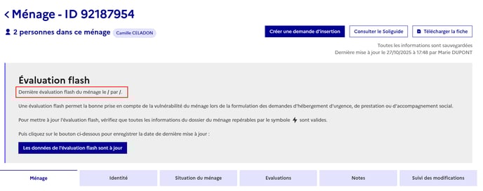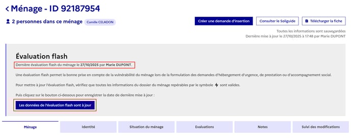 1️⃣ A tout moment, en cliquant sur " Les données de l'évaluation flash sont à jour" dans le bandeau se trouvant au dessus des onglets du dossier du ménage :