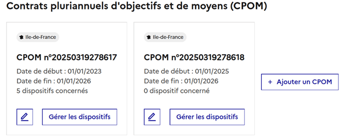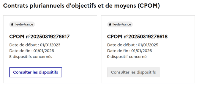- Le nombre de dispositifs rattachés sous ce CPOM : si des dispositifs ont été ajoutés à ce CPOM, le bouton « Consulter les dispositifs » devient actif et affiche la liste des dispositifs sous ce CPOM.