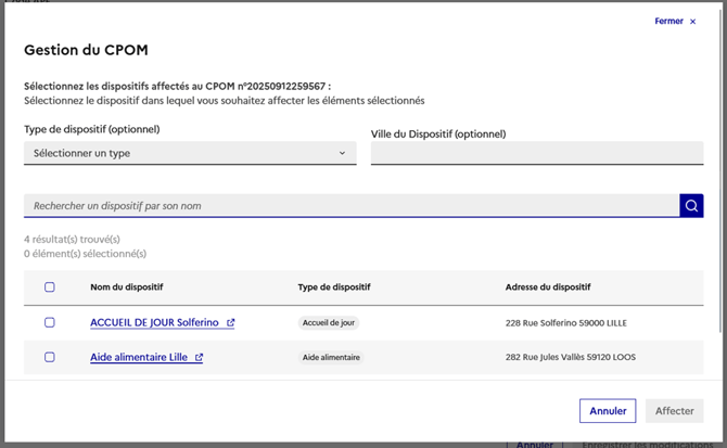 Il suffit ensuite de cocher les dispositifs à affecter au CPOM et confirmer l’action d'affectation.