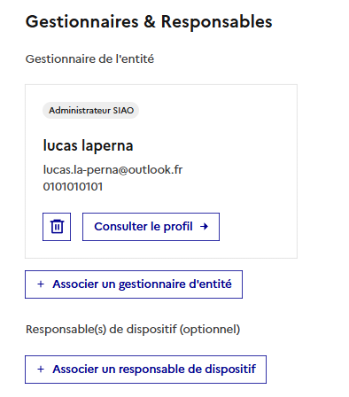 Cliquez sur les boutons correspondants pour compléter les informations du gestionnaire de l’entité et des responsables du dispositif (nom, prénom, courriel, type de profil, téléphone). Vous pouvez également consulter le profil des gestionnaires en cliquant sur le bouton prévu à cet effet.