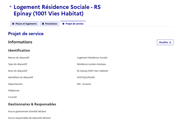 Pour modifier les informations générales d’un dispositif, ouvrez l’onglet Dispositif, recherchez celui de votre choix, puis accédez à l’onglet Projet de service et cliquez sur Modifier.