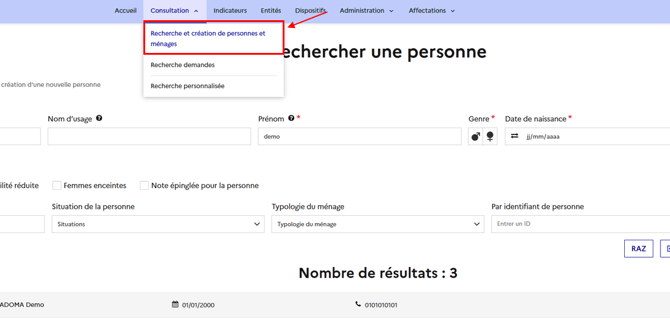 Pour ceci, il faut accéder au ménage via la recherche de personnes dans l’onglet « Consultation ».
