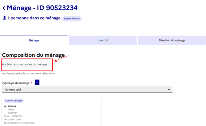 L’onglet Ménage permet d’accéder aux demandes via la fiche du ménage.