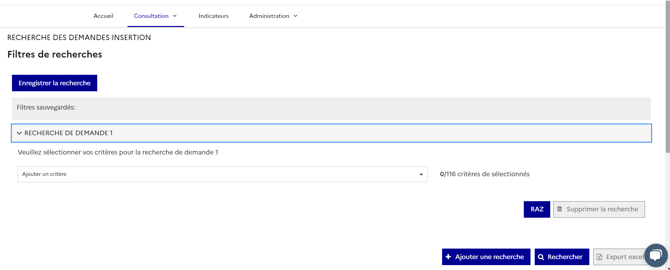 Pour effectuer une recherche, cliquer sur le tiroir "Recherche de demande 1" et ajouter un ou des critères de recherche. Pour information, les critères sont cumulatif, ils comptent de la manière suivante : "critère 1 ET critère 2 ET critère 3" et non pas "critère 1 OU critère 2 etc".