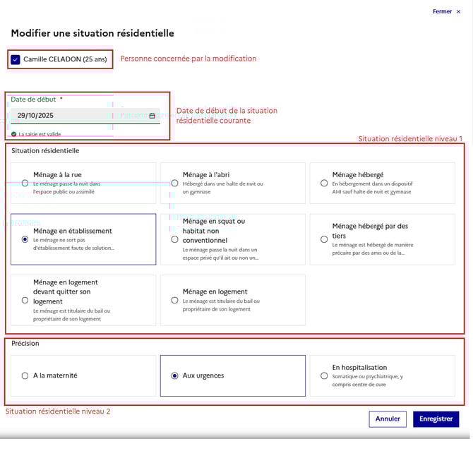 Ecran de modification de la situation résidentielle courante d'une personne :