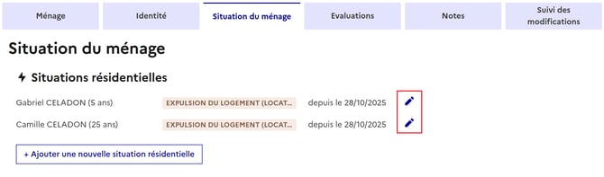 Il est possible de corriger la situation résidentielle actuelle (courante), pour une personne spécifique du ménage en cliquant sur le crayon en bout de ligne de la personne concernée.