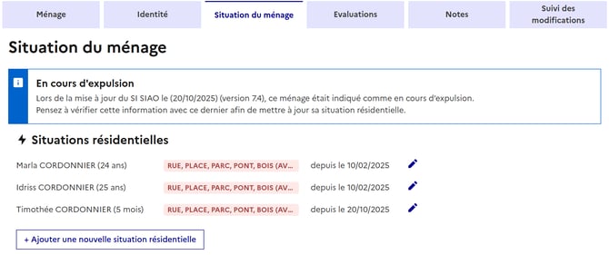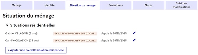 La situation résidentielle actuelle d'une personne est visible en 3 endroits du dossier du ménage :