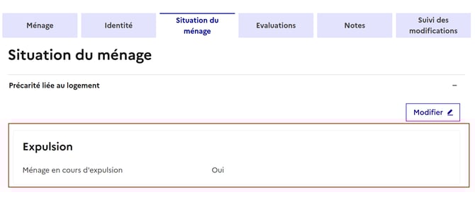 Aussi, si le ménage était considéré comme en cours d'expulsion (Ménage en cours d'expulsion = OUI) avant la mise à jour du SI, alors un bandeau d'alerte persistera aprÚs la bascule (voir ci-dessous). Il s'effacera automatiquement dÚs lors que la mise à jour (modification, ajout) de la situation résidentielle aura été enregistrée par un utilisateur.Suppression du champ "Expulsion" :