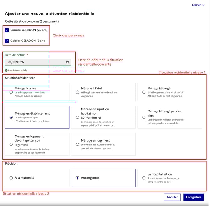 Ecran d'ajout d'une nouvelle situation résidentielle :